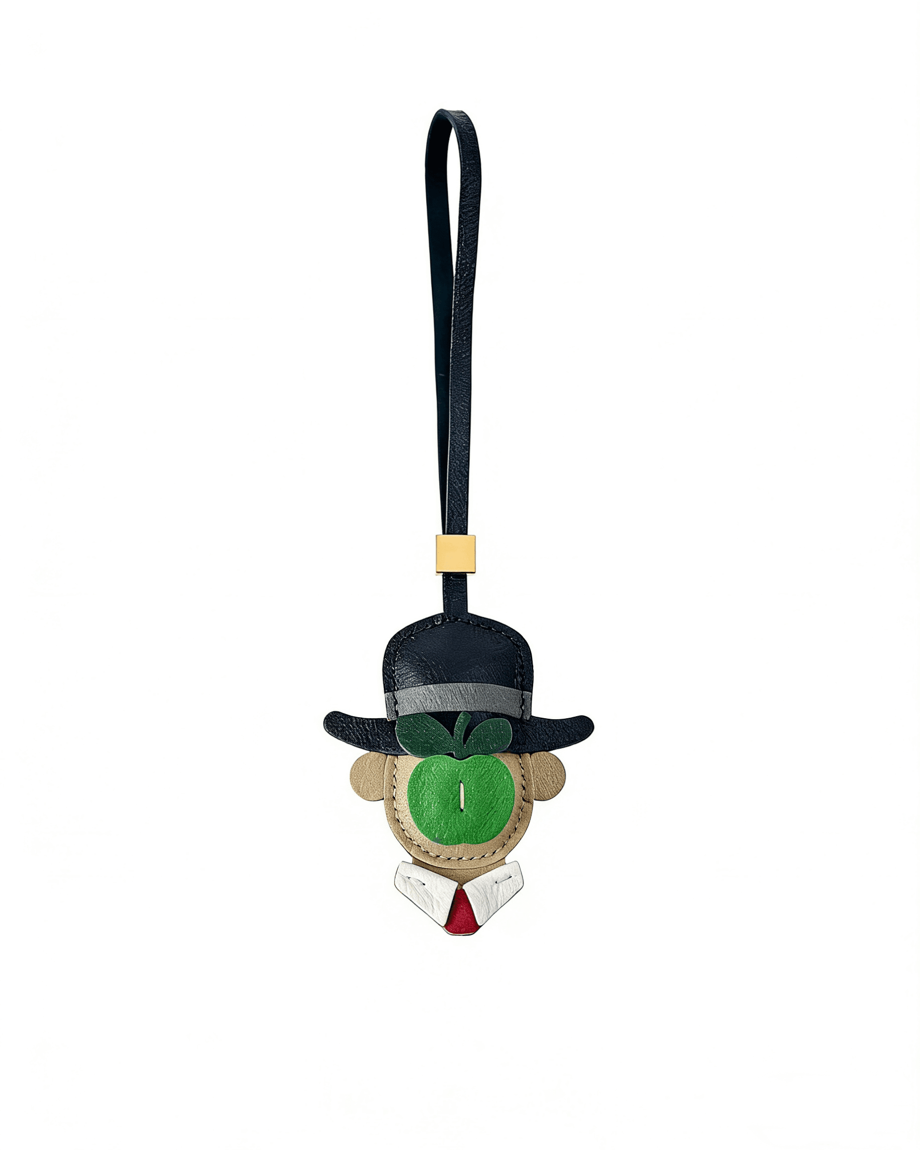 Forged from rugged full-grain cowhide and stitched by hand, this apple gentleman charm hangs by your side like a tiny piece of surrealist art, plucked straight from a canvas. With its sleek black top hat, whimsical green apple face, and crisp formal collar, it carries the quiet intrigue of surrealist masterpieces, the elegance of vintage menswear, and the playful magic of seeing the world differently. Each stitch tells a story of careful craft, and the leather softens with time, just like the worn edges of a favorite art book—growing warmer, richer, and more beloved with every creative moment it witnesses. It’s not just an accessory; it’s a reminder to keep your imagination alive, to savor the beauty of the unexpected, and to carry a little piece of artistic whimsy wherever you go.