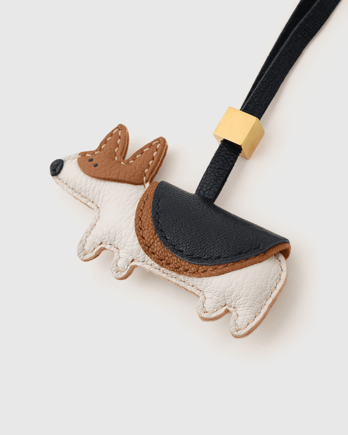 - Premium Handcrafted Full-Grain Cowhide: Meticulously hand-cut and hand-stitched from top-grade genuine full-grain cowhide, this charm perfectly recreates the iconic adorable silhouette of a Welsh Corgi, with a classic tri-color white, tan and black scheme, lifelike pointed ears, signature short legs, playful walking pose, exquisite saddle detailing, and a durable black leather cord finished with a polished gold square accent. The natural, textured leather develops a warm, rich patina with regular use, while reinforced precision stitching ensures it retains its lively, charming character for years of daily wear, unlike flimsy mass-produced charms that fray, fade or lose their shape within months.