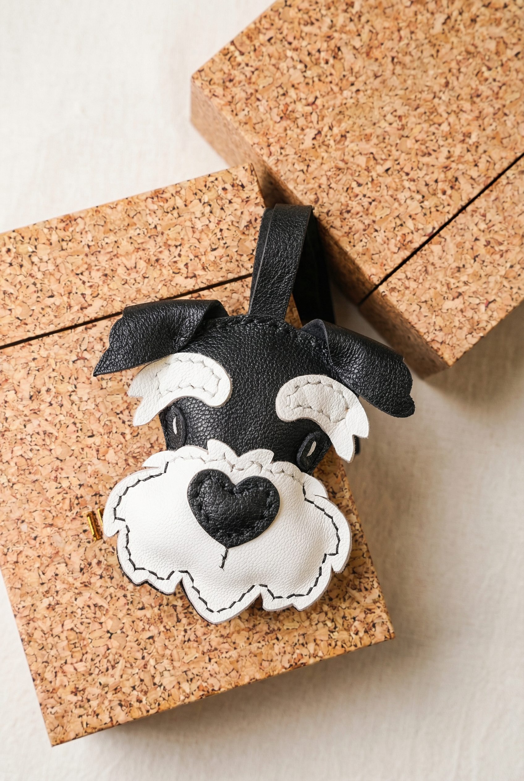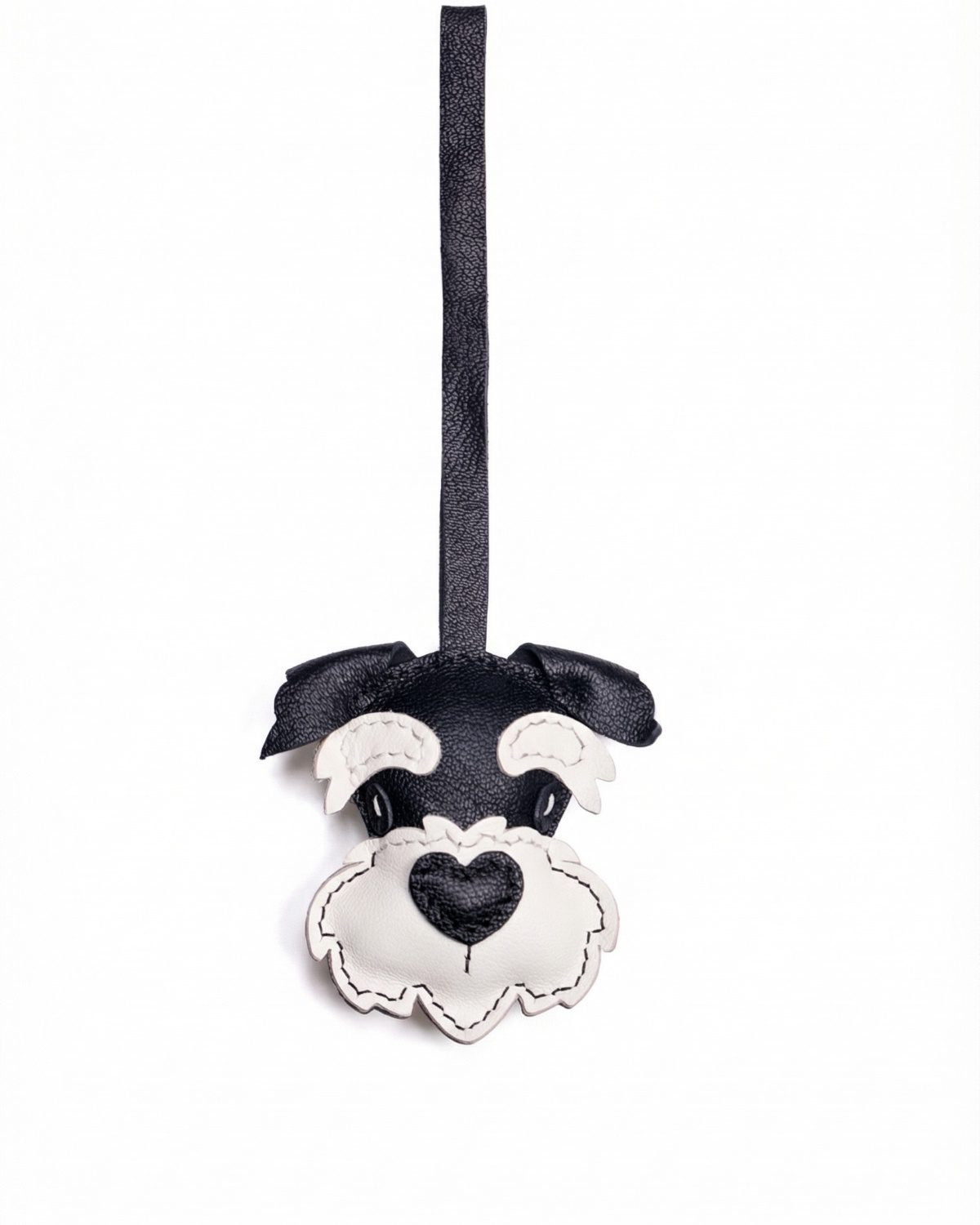 Forged from premium cowhide and paired with a soft black satin ribbon, this little black Schnauzer head charm hangs by your side — carrying the quiet dignity, warm snuggles, and unwavering loyalty of a beloved pup, plus a touch of understated elegance into every step you take. The sleek black head, crisp white eyebrows and beard, and charming heart-shaped nose capture the distinguished, gentle spirit of the Schnauzer breed, while the satin ribbon adds a refined, graceful touch. The leather softens and develops a warm patina over time, just like the bond between human and hound, growing richer and more precious with every shared smile. It’s a tiny piece of heartfelt craft, a reminder of wet noses, wagging tails, and the quiet magic of turning ordinary moments into something wonderful, with a sleek black hue that exudes quiet sophistication.