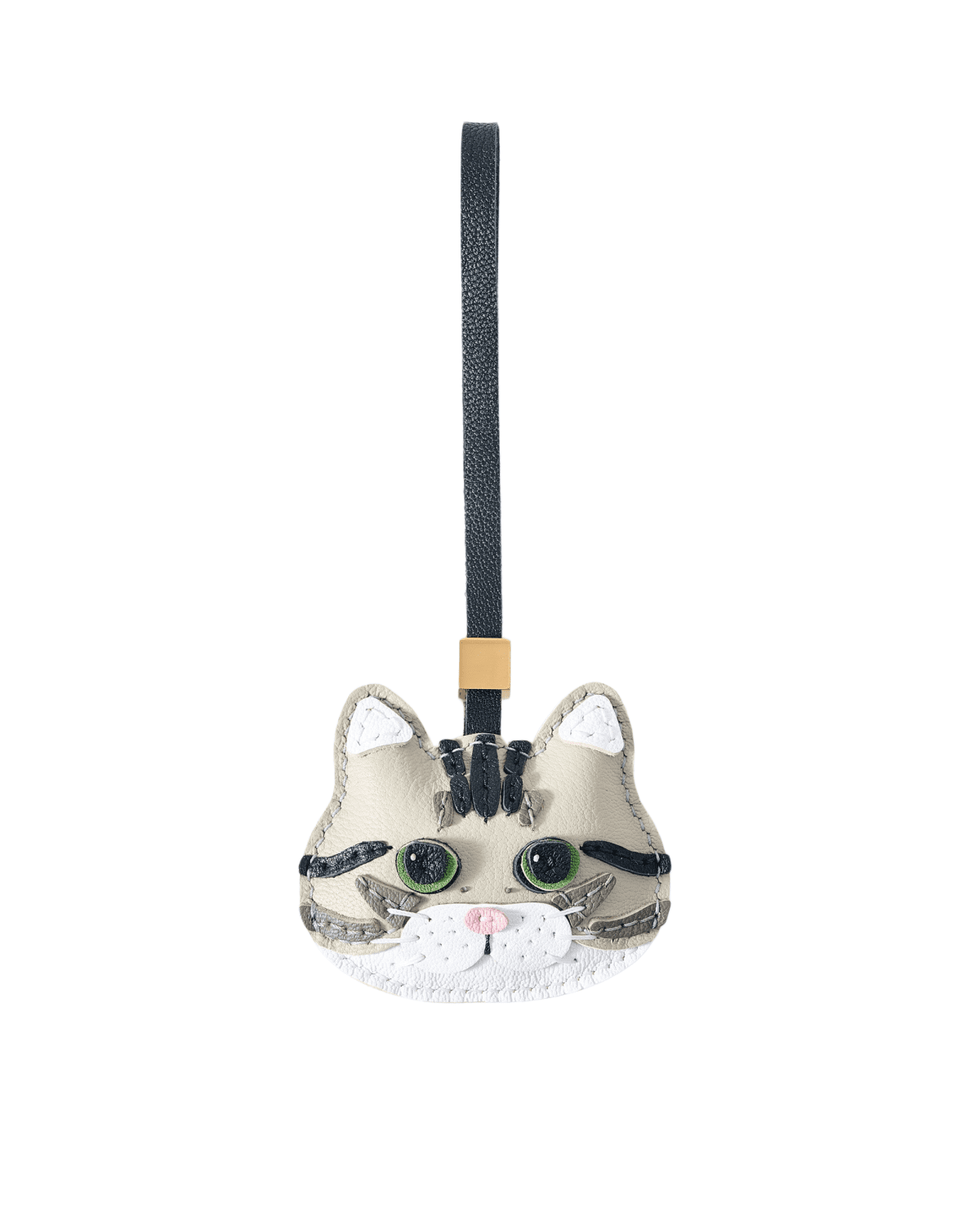 • Premium Handcrafted Full-Grain Cowhide: Meticulously hand-cut and hand-stitched from top-grade genuine full-grain cowhide, this charm perfectly recreates the iconic face of a classic tabby cat, with a soft beige base, bold black striped markings, bright green round eyes, crisp white whiskers, a delicate pink nose, and a durable black leather cord finished with a polished gold square accent. The natural, textured leather develops a warm, buttery patina with regular use, while reinforced precision stitching ensures it retains its lively, charming character for years of daily wear.
