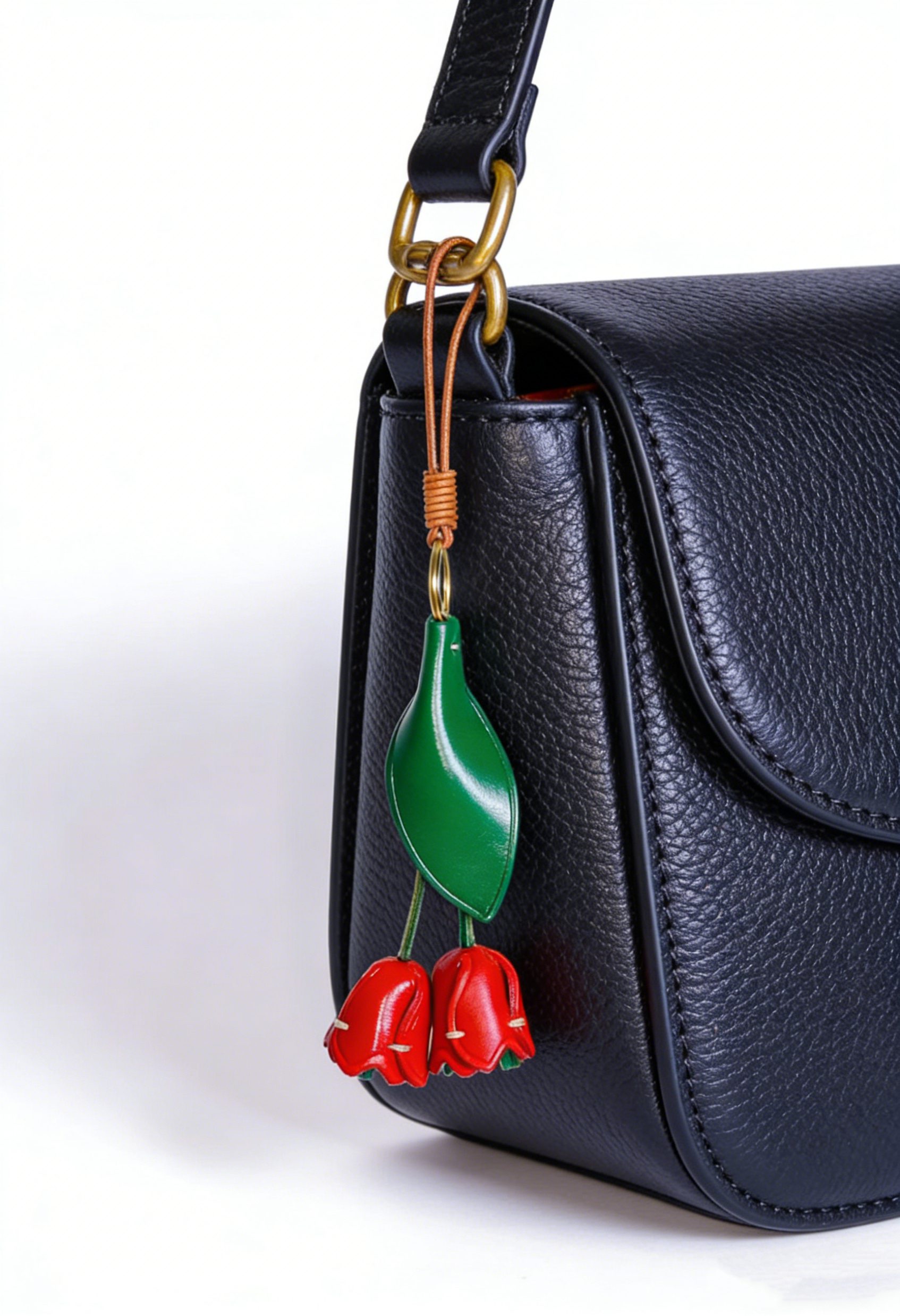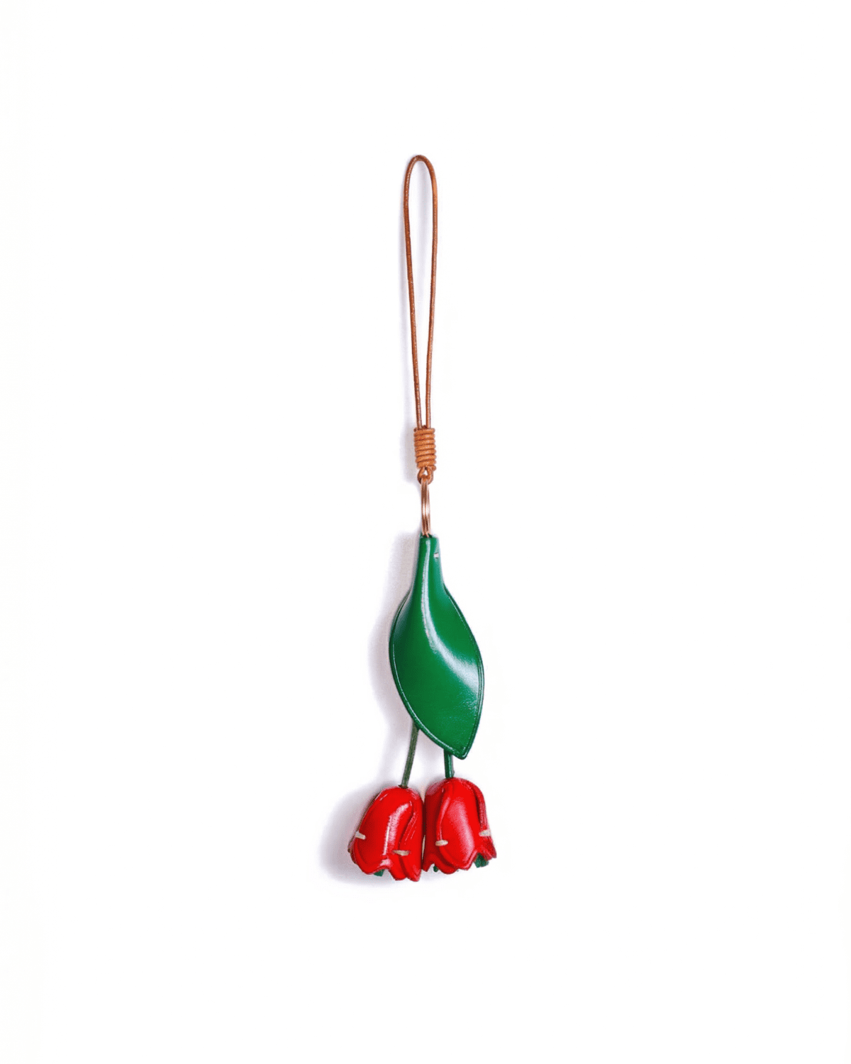 Forged from premium cowhide and stitched by hand, this little tulip charm hangs by your side — carrying the bright warmth of a spring morning and the bold beauty of blooming flowers into every step you take. The vivid red cup-shaped blooms dangle gently from a lush green leaf, as if caught mid-sway in a fresh spring breeze. The rich leather softens with time, just like the quiet magic of nature and the joy of watching life burst into color. It’s a tiny piece of heartfelt craft, a reminder to embrace the vibrancy of each day and cherish the beauty that surrounds us.
