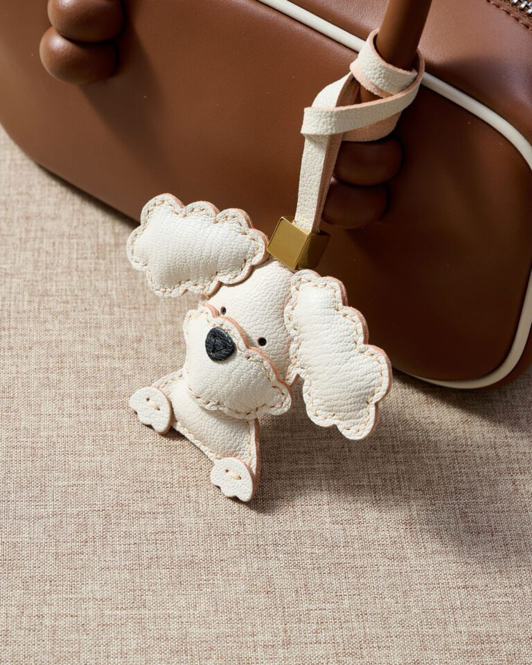 Handmade Leather Big-Ear Teddy Dog Charm (Tan with Gold Accent)